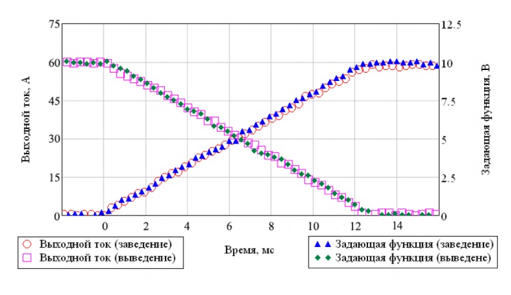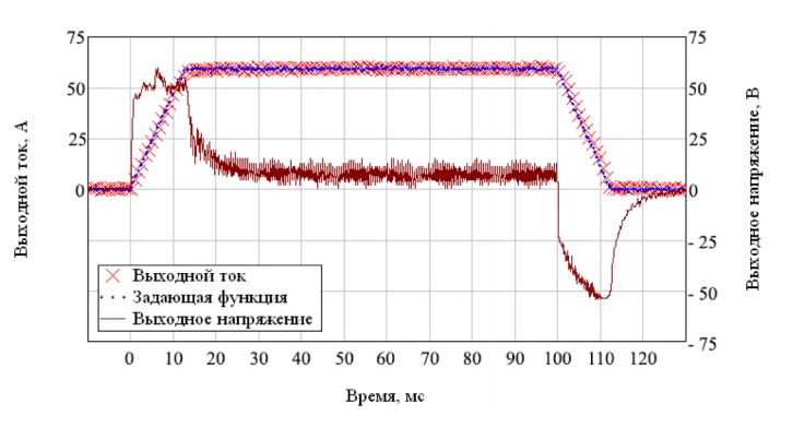 Источник позволяет регулировать величину тока в диапазоне от нуля до 65 А, при этом выходная мощность может достигать 6 кВт, что в 2 раза больше чем у предыдущей модели источника. Для компенсации ЭДС самоиндукции, возникающей при изменении тока в нагрузке, источник динамически регулирует выходное напряжение с помощью системы обратных связей, что позволяет обеспечить требуемую скорость изменения тока. Диапазон регулирования напряжения составляет ±150 В, что выше в 1,5 раза, чем ранее. Ограничения по мощности при достижении максимальных значений напряжения приводят к переключению источника в режим стабилизации напряжения, что, с одной стороны, снижает скорость изменения тока, а с другой обеспечивает защиту источника от перегрузки.