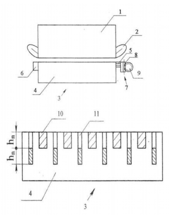 Регулируемый линейный асинхронный двигатель с увеличенным пусковым усилием схематически показан на рис. 1. Индуктор содержит 1 трехфазную обмотку 2, а в сердечнике 4 вторичного элемента 3 кроме основных пазов 10, в которых расположены стержни 5 основной короткозамкнутой обмотки ВЭ, выполнены дополнительные пазы 11 для размещения пусковой обмотки ЛАД. Стержни 12 пусковой короткозамкнутой обмотки размещены в нижних частях дополнительных пазов для увеличения эффекта вытеснения тока при пуске двигателя. Для увеличения пускового тягового усилия подвижный элемент замыкает только стержни пусковой обмотки. При «глубоком» расположении стержней 12 эффект вытеснения тока значителен, что позволит повысить пусковое тяговое усилие двигателя. По мере разгона ЛАД подвижный элемент замыкает частично одновременно стержни основной и пусковой обмоток ВЭ, а затем в номинальном режиме пусковая обмотка размыкается, а основная полностью закорачивается, что повышает КПД линейного двигателя.