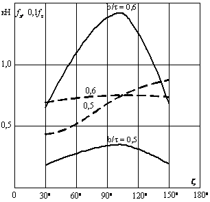 Рис.3. Зависимости удельных сил тяги (сплошные линии) и левитации (пунктирные линии) от угла регулирования ς при частоте fс=5 Гц различных значениях параметра b/τ.