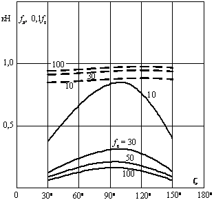 Рис. 4. Зависимости удельных сил тяги (сплошные линии) и левитации (штриховые линии) от угла регулирования ς при различных частотах питания fс и b/τ=0,6.
