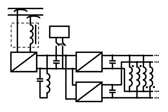 Размещение статических преобразователей энергии на экипаже КСЛТ характеризуется рядом преимуществ по сравнению с вариантом стационарного размещения преобразователей: обеспечивает гибкое и независимое управление экипажами, что облегчает задачу регулирования объемов движения при колебаниях пассажиропотоков, упрощаются и удешевляются преобразовательные агрегаты тяговых подстанций, бортовые преобразователи обеспечивают возможность управления всеми режимами движения – пуском, движением по участку, торможением. Рассмотрены два варианта энергообеспечения бортовых электромагнитов: электроснабжение от сети постоянного напряжения Uс=3 ... 5 кВ и сети переменного напряжения такого же уровня. Поскольку реализуемые скорости движения относительно невелики (до 150 – 200 км/ч), предполагается использование подвижного токосъема с контактного рельса. Принципиальные схемы обоих вариантов представлены на рис. 5 и рис. 6.