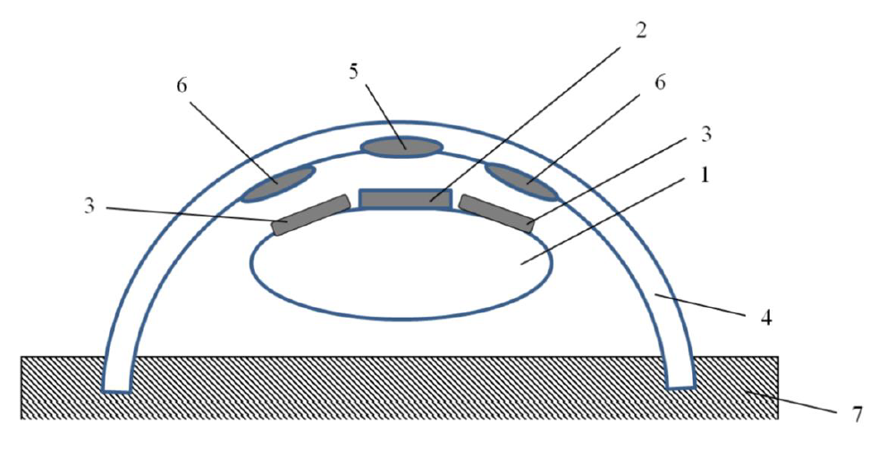 На рис. 1 обозначены: 1 – малогабаритный транспортный модуль, 2 – магнитный источник транспортного модуля для взаимодействия с обмоткой ускоряющего электромагнита, 3 – магнитные источники транспортного модуля для взаимодействия с обмоткой электромагнитного ограничителя перемещений, 4 – несущая конструкция арочной эстакады, 5 – виток обмотки ускоряющего электромагнита, 6 – витки обмотки электромагнитного ограничителя перемещений, 7 – опорная поверхность.