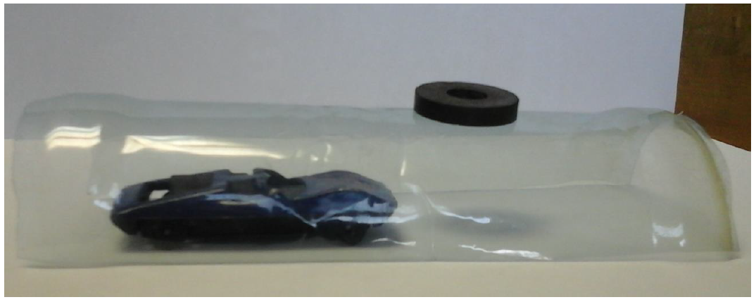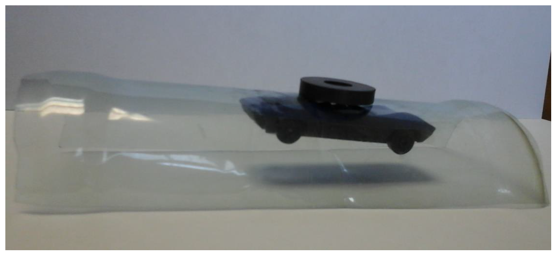 Если изменить перевернуть кольцевой магнит (поменять полярность), перемещение будет осуществляться относительно опорной поверхности за счет отталкивания кольцевым магнитом магнитного источника внутри модели автомобиля (рис. 4).