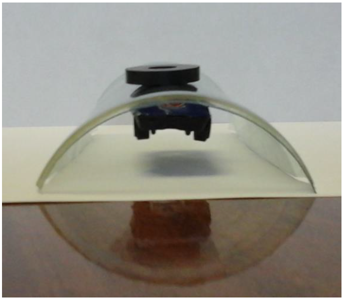 Несущая конструкция макета арочной эстакады выполнена из немагнитного материала – пластика. В качестве модели транспортного модуля используется модель автомобиля, внутри которой установлен источник постоянного магнитного поля. Магнитное подвешивание модели осуществляется при помощи постоянного ферромагнита (в данном случае кольцевой формы), который расположен сверху несущей конструкции. При перемещении кольцевого магнита, например, рукой – модель автомобиля перемещается вместе с ним относительно внутренней поверхности арочной эстакады (рис. 2, 3).