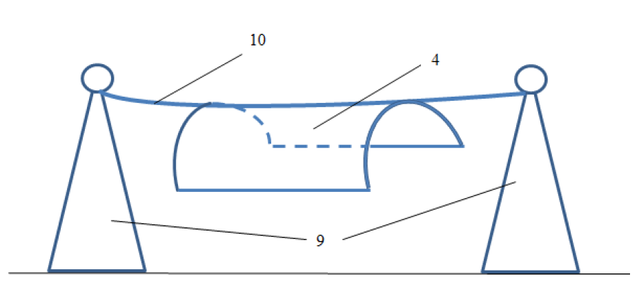 Для переправы через реки конструктивные элементы арочной эстакады могут подвешиваться на тросах (канатах) между высотными опорами, как это показано на рис. 6, где фрагмент арочной эстакады 4 подвешен между опорами 9 при помощи троса 10.