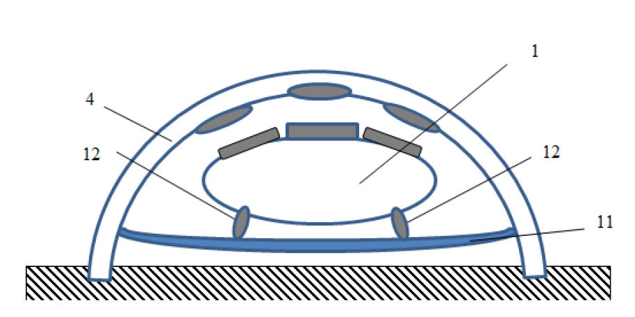 Для обеспечения безопасности транспортного модуля арочная эстакада может дополняться желобом, а транспортный модуль – колесными опорами [7]. На рис. 7 показано, что транспортный модуль 1 дополнен колесными опорами 12, а несущая конструкция эстакады дополнена поддоном 11. В случае нарушения условий магнитного подвешивания (например, пропадания сверхпроводимости) транспортный модуль стаёт колесными опорами на поддон и перемещается под управлением либо ускоряющего электромагнита, либо другого движителя (например, аккумулятора).