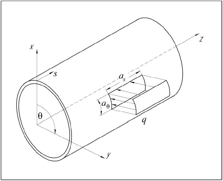 Рис. 1. Цилиндрическая оболочка, нагруженная внешней нагрузкой q распределенной на виртуальном элементе