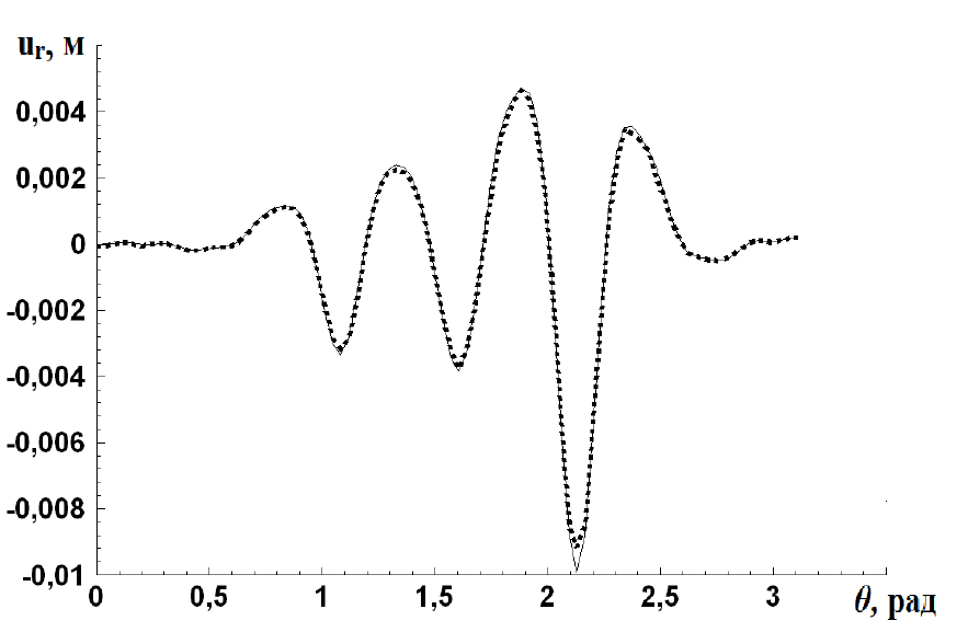 На рис.2 сплошной линией показано изменение по окружности радиального перемещения оболочки в зоне приложения сил. На рис.2 штриховой линией показано изменение радиального перемещения , полученное при использовании программы ANSYS. Максимальное отклонение результатов расчета, вычисленное как (где - среднее значение перемещения) не превышает 6.7%. На рисунке видны три характерных локальных прогиба оболочки в местах приложения нагрузки при =/3, =/2, =2/3. При нагрузке прогиб, естественно, увеличенный.