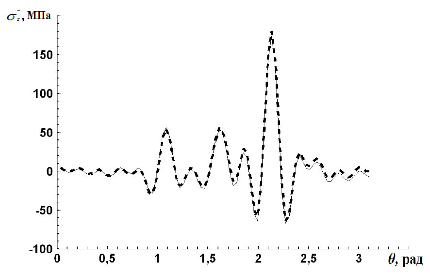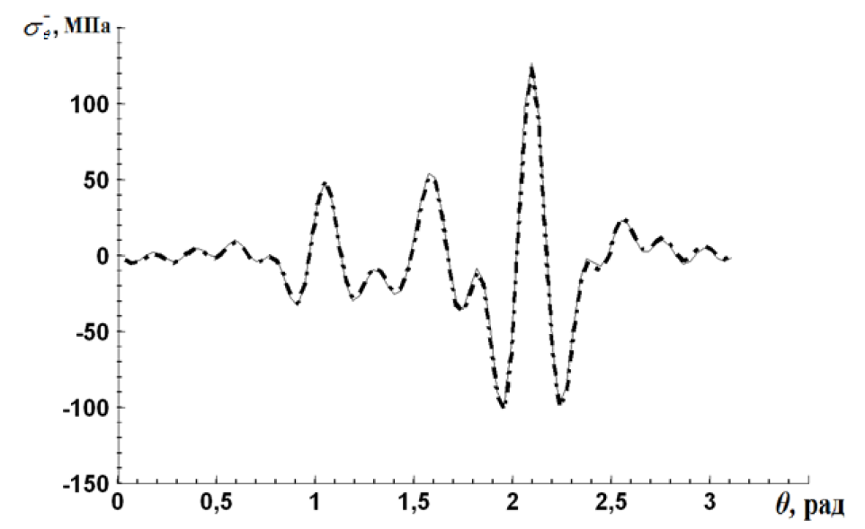 На рис.4 сплошной линией показано изменение окружного напряжения на внутренней поверхности оболочки по окружности в зоне приложения сил. На рис.4 штриховой линией показано изменение окружного напряжения на внутренней поверхности оболочки, полученного при использовании программы ANSYS. Максимальное отклонение (где - среднее значение напряжения) не превышает 0.6%.