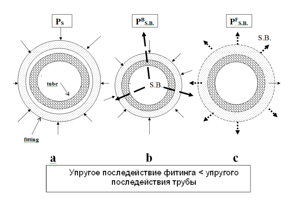 Деформация фитинга, которая сопровождается его сжатием, приводит к непосредственному контакту внутреннего диаметра фитинга и внешнего диаметра трубы. Дальнейшее действие сжимающей нагрузки вызывает деформацию трубы. В этом случае сопротивление сжимаемых материалов действию внешней нагрузки растет и возникает эффект упругого последействия материалов фитинга и трубы (PBS.B.). Рисунок 4 (позиция "б") показывает позицию контактирующей пары на этой стадии деформации.