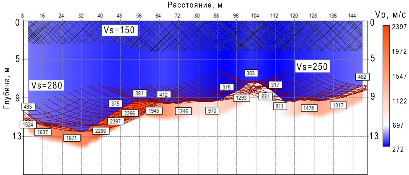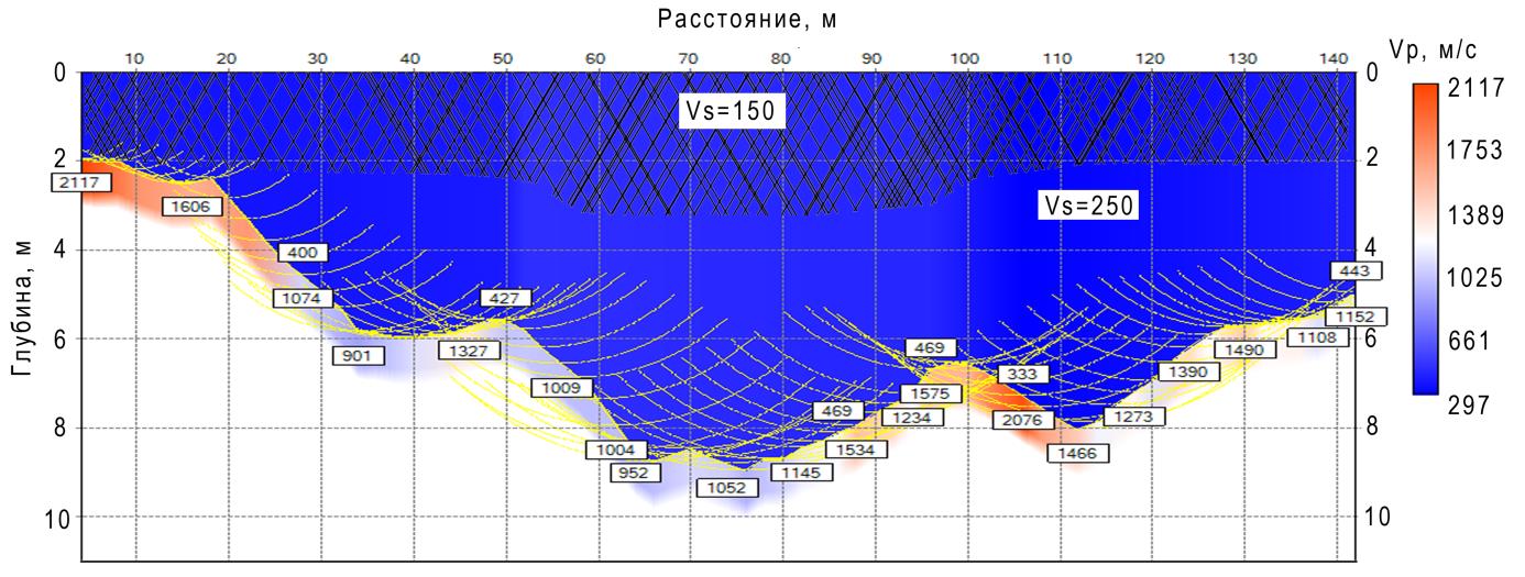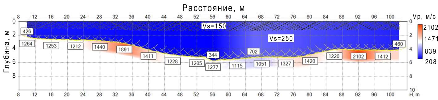In the lower layer, high boundary velocities up to 2397 m/s are registered, which presumably correspond to clay water-saturated depositions [7].