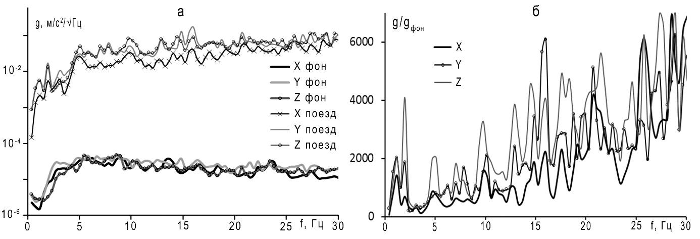 Picture. 5. Spectra of impacts before and during freight train traffic for unfavourable section of subgrade (a) and spectra of acceleration during train traffic (b)