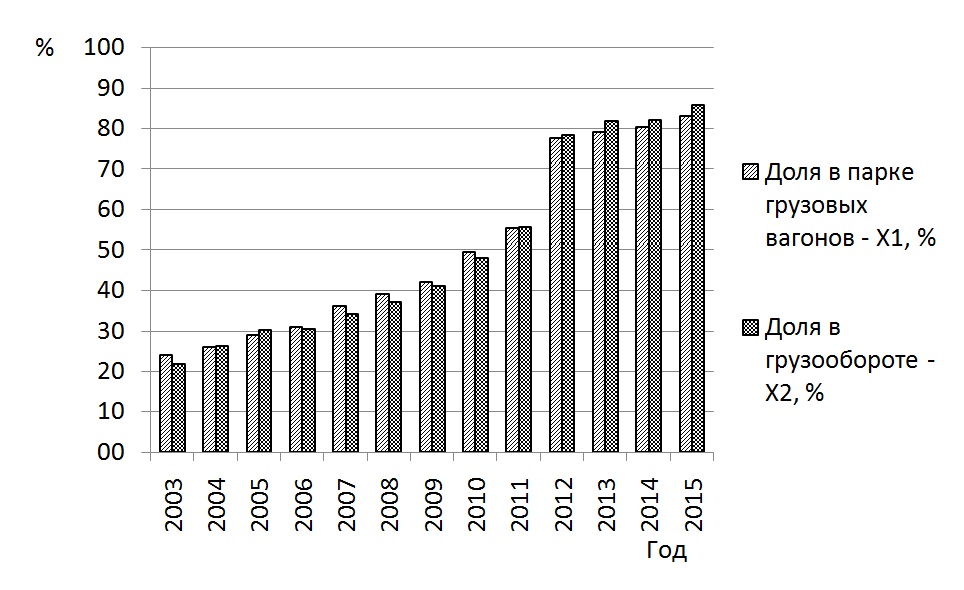 Как видно из рис. 1, доли независимых частных собственников в парке грузовых вагонов (переменная X1) и в грузообороте (переменная X2) железнодорожного транспорта РФ непрерывно росли на протяжении 2003-2015 гг.. Увеличение составило приблизительно с 20-22 до 80-85% (к концу 2016 года переменная X1 достигла значения 83.7%, переменная X2 достигла значения 86.4%, существенно не изменившись по отношению к уровням 2015 года [20]).