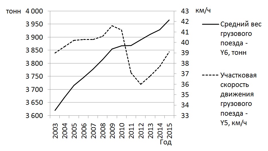 Что касается показателей операционной эффективности ОАО "РЖД", не ориентированных, на наш взгляд, на потребности грузоотправителей, то на протяжении 2003-2015 гг. средний вес грузового поезда (переменная Y6) постоянно увеличивался, а участковая скорость движения (переменная Y5) почти не менялась (хотя и демонстрировала сильную волатильность) (рис. 2) (в 2016 г. уровни переменных Y5 и Y6 существенно не отличаются от уровней 2015 г. [20] ).