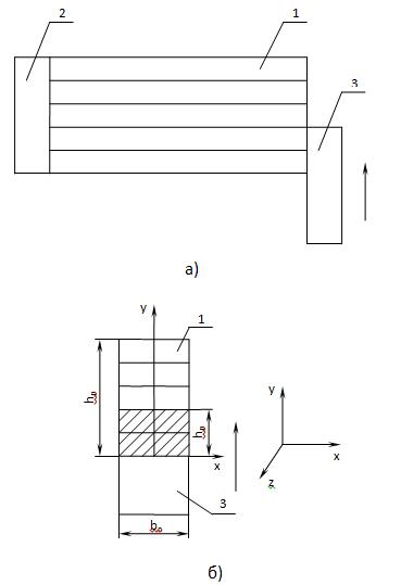 Рис. 2. Закорачивание проводников в пазу при движении замыкающего элемента снизу вверх: а) фрагмент обмотки; б) паз; 1 – проводники стержня; 2 – шина; 3 – замыкающий элемент