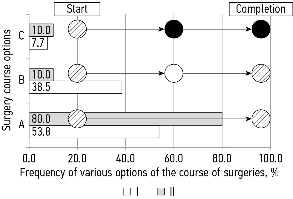 Fig. 1. Changes in motor evoked potentials (MEPs) during surgical spinal deformity correction in patients with congenital deformity (I) and idiopathic scoliosis (II). The abscissa axis is the frequency (%) of various surgical options. The ordinate axis presents surgical options: A) uneventful course of surgical intervention; B) emergence of unstable MEPs in form and characteristics; C) dangerous decrease in MEP amplitude. Hatching indicates high-amplitude stable basic MEPs and responses that remained at the base level at the end of the surgery. The white color indicates unstable MEPs in form and characteristics. The black color indicates a critical decrease in the MEP amplitude