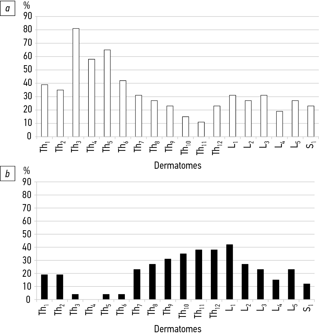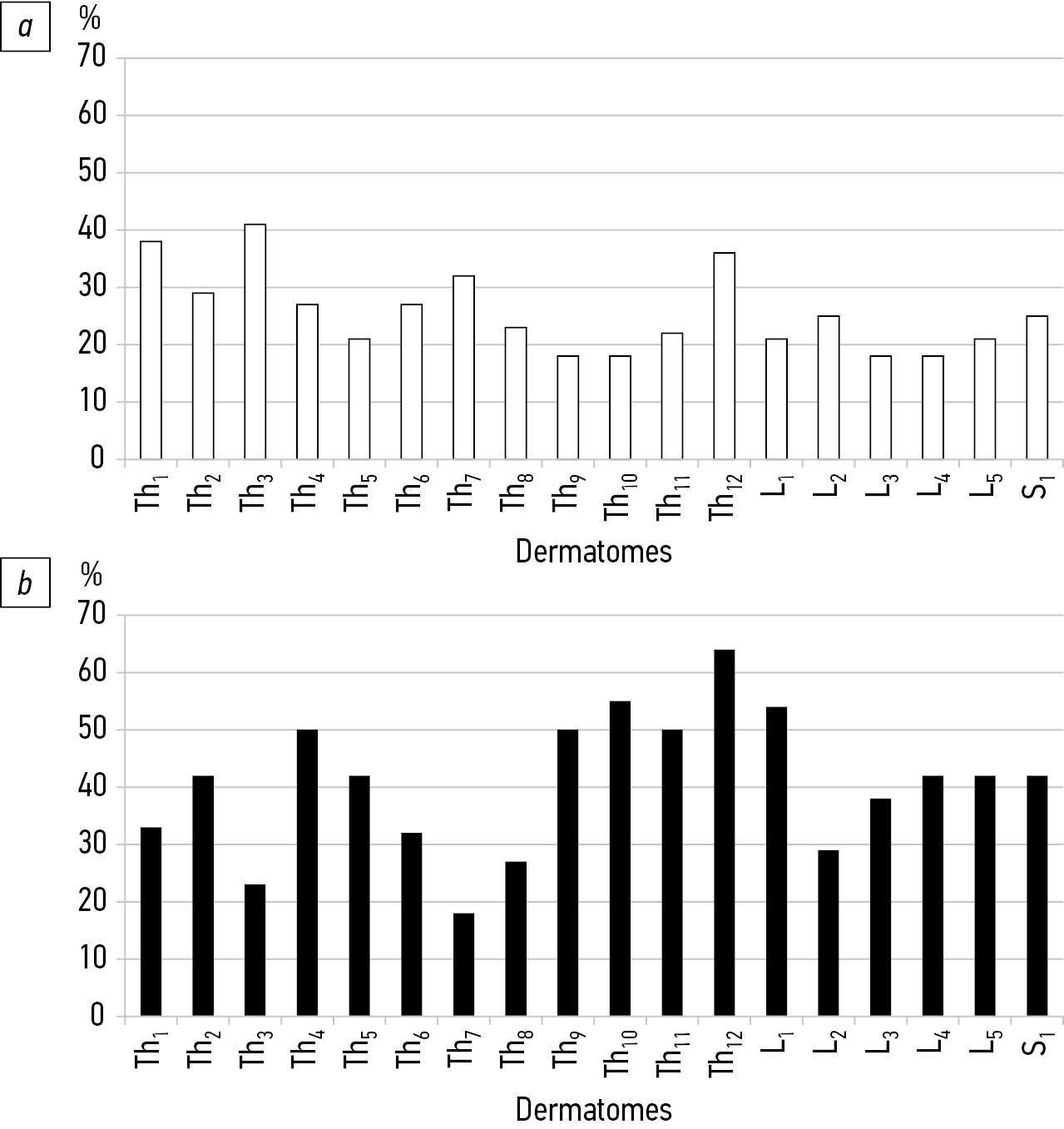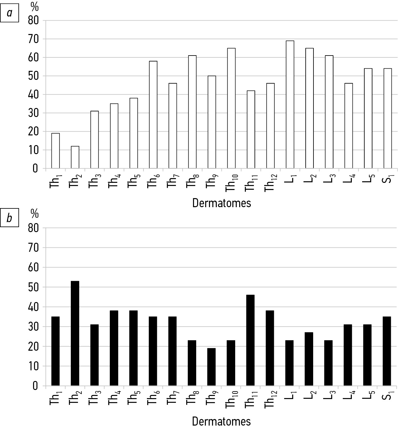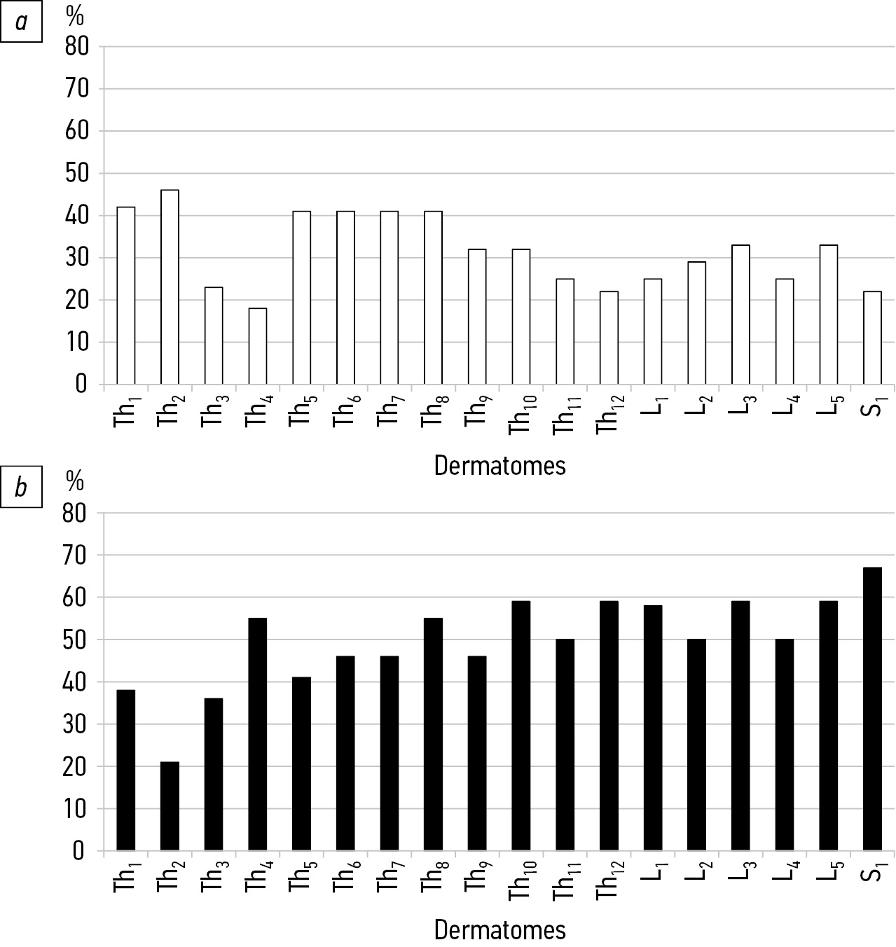 The dynamics of positive and negative thermal sensitivity changes in different dermatomes can be registered in antiphase (Fig. 4). Thus, the improvement prevailed in Th1–Th7 dermatomes (Fig. 4a). Negative changes were minimal (Fig. 4b). The parity of negative and positive changes was registered in the Th8 dermatome. The deterioration of thermal sensitivity prevailed from the Th9 to L1 levels (area of the main and compensatory curves of deformity and surgical intervention). The same values of multidirectional changes were recorded in the L2 and S2 dermatomes. Positive changes prevailed in L3, L4, L5, and S1.
