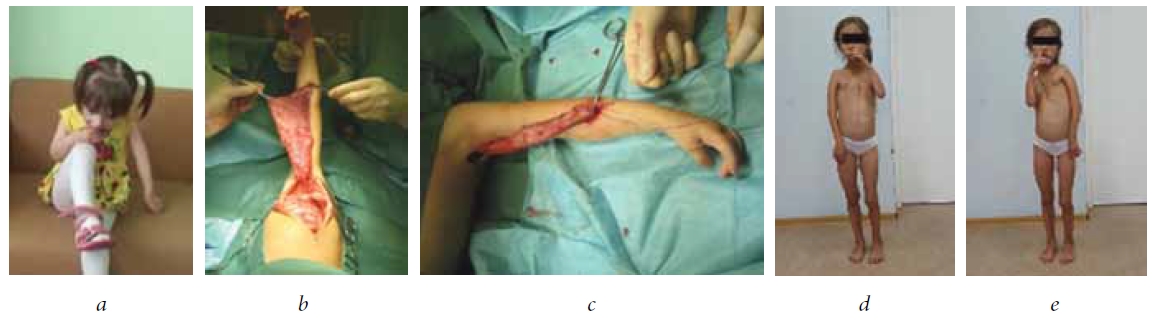 Fig. 3. Good result of monopolar grafting of the broadest muscle of the back in the position of the forearm flexors bilaterally in patient C., 3 years: a — passive flexion in the right elbow joint using compensatory and adaptive movements; b, c — stages of the surgery; d, e — active flexion in the elbow joints 4 years after the surgery