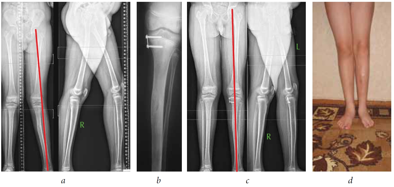 According to radiographs and CT images, there was marked hypoplasia of the lateral condyle of the right femur. Considering the localization of the deformity, patient age, hypoplasia of the lateral condyle and the external torsion of the femur, we decided to perform two-stage deformity correction. The first stage was temporary hemiepiphysiodesis of the inner portion of the distal growth zone of the right femur with a figure-of-eight plate for eliminating the varus component of the deformity and level the size of the femoral condyles. The postoperative period was uneventful. The function of the knee joint at the time of hospital discharge (5 days postoperatively) was complete. The patient was followed up every 3 months. The deformity was eliminated (Fig. 1, d), and the plate was removed 380 days after the primary surgery.