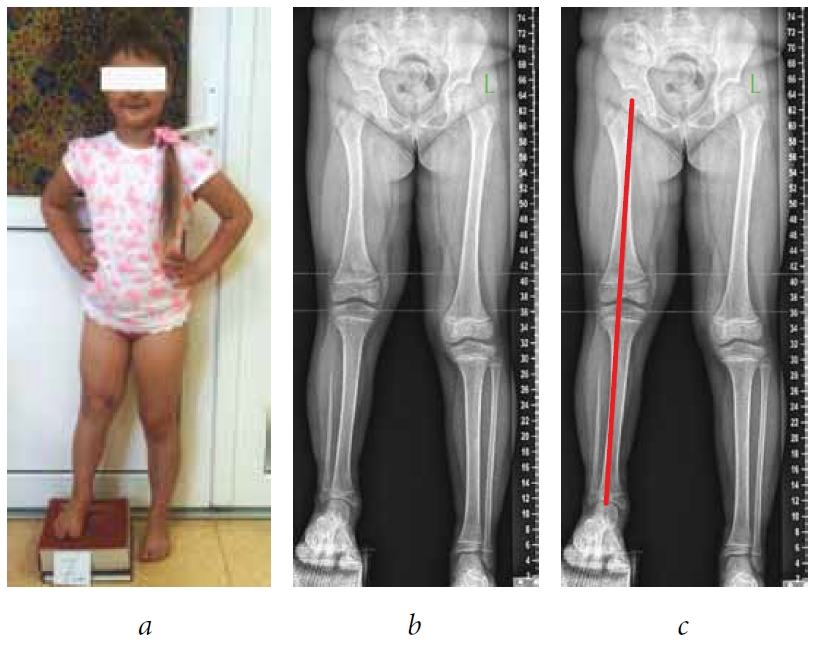 Fig. 2. Patient P. before the second stage of surgical treatment: а — photo of the patient; b — panoramic radiographs of the lower extremities; c — a common mechanical axis of the limb is drawn on a panoramic radiograph