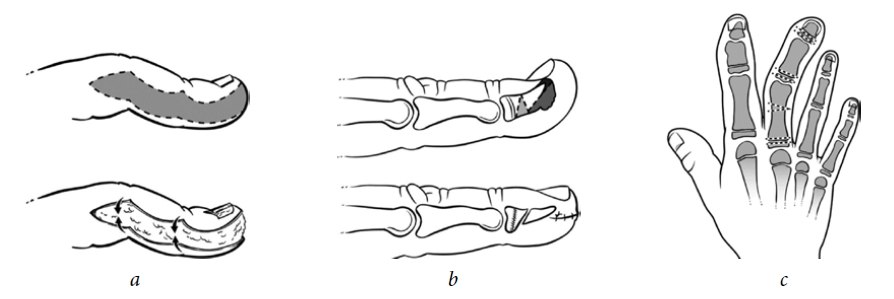 This surgical technique also depends on the severity of the hyperplastic segment. With an increase in subcutaneous fatty tissue predominantly on the palmar surface of the nail phalanx, the authors recommend excision of the skin and soft tissues with an ellipsoid incision in the center of the palmar surface of the phalanx, which enables the maintenance of innervation and sensitivity at the fingertip. It is also noted that the ellipsoid incision should not reach the level of the interphalangeal joint so as to avoid secondary cicatricial contractures. This surgical intervention is a good method for prevention of ingrowth of the nail plate in the hyperplastic periungual folds.