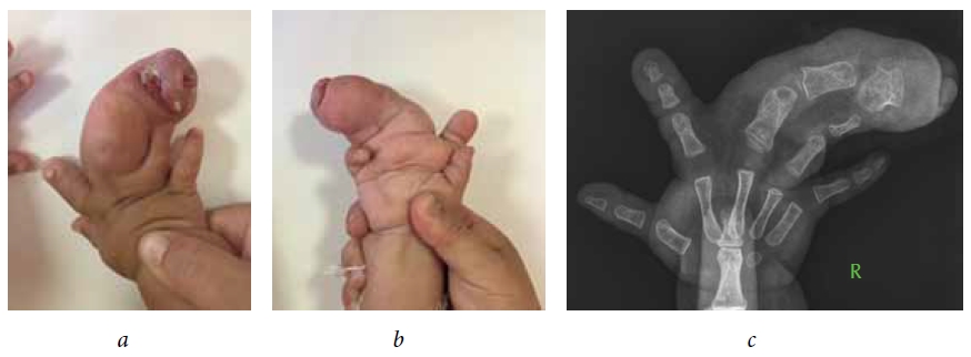 Fig. 2. Macrodactyly of fingers 2–4 of the right hand in a child of two years: a, b — appearance before the surgery; c — radiograph of the hand