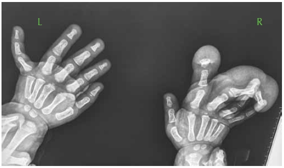 Fig. 6. Radiograph of the hand of a child of 1.5 years of age with macrodactyly of the right hand