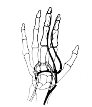 These surgeries had technical aspects compared with standard microsurgical grafting in case of other congenital and acquired defects. Thus, in all patients there were hypoplastic common palmar digital arteries, as well as their branched type of structure as compared with the normal segment anatomy. This necessitated the connecting of the grafted vessels more proximally, namely at the level of the wrist joint. A positive factor of the technical aspects was the possibility of preserving the flexor tendon ligaments during reconstruction, which enabled us to further reduce the amount of tenolysis and improve the functional result. In all cases, during the revision, we noted significant hyperplasia and tortuosity of the median nerve, which was also left intact.