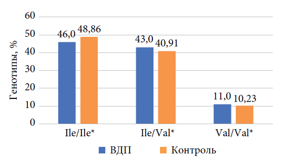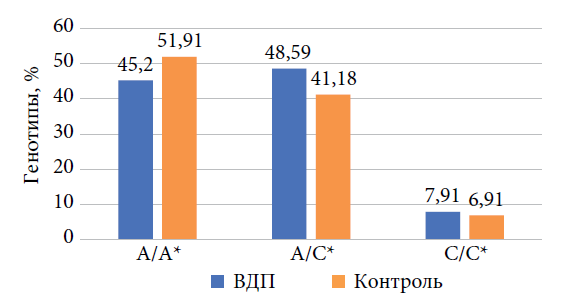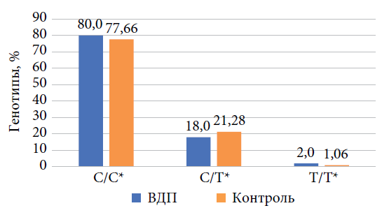 Следует также отметить, что носители мутантного аллеля среди больных ВДП составили 46,36 %, в то время как в контрольной группе — только 21,87 %.