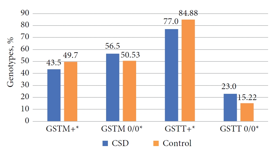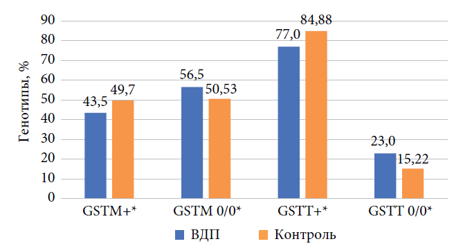 В группе обследованных 79,5 % больных имели делеции генов GSTM1 или GSTT1, а 13,5 % — делецию обоих генов. Это может являться важным фактором этиологии ВДП. В контрольной группе делеция того или иного гена этой группы составляла 65,77 %, а обоих генов — 9,47 % (p < 0,05).