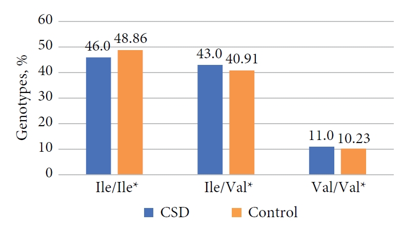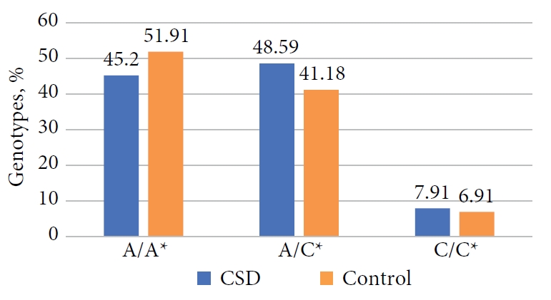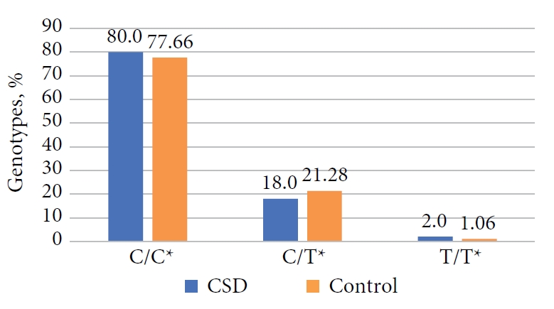 Из литературных данных известно [22], что наличие С-аллеля характеризует замедленный метаболизм ксенобиотиков. В нашем исследовании выявлено, что 56,5 % больных ВДП имели аллель медленного метаболизатора, в то время как в контрольной группе этот показатель составлял 48,1 %.