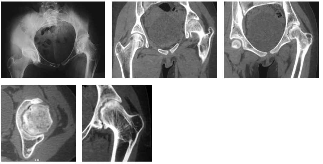 Fig. 2. Radiograph and computed tomography (CT) scan of the hip joints. Deforming coxatrosis. The femoral head is deformed, has an irregular shape, and has an uneven contour. The cotyloid cavity also has an uneven contour. Joint space is sharply narrowed and is wavy because of the closure of the articular surfaces of the head and cavity of “puzzle” type. Degenerative-dystrophic changes in the form of areas of subchondral sclerosis, cystic changes, and marginal bone growths. Adduction contracture at an angle of 40°