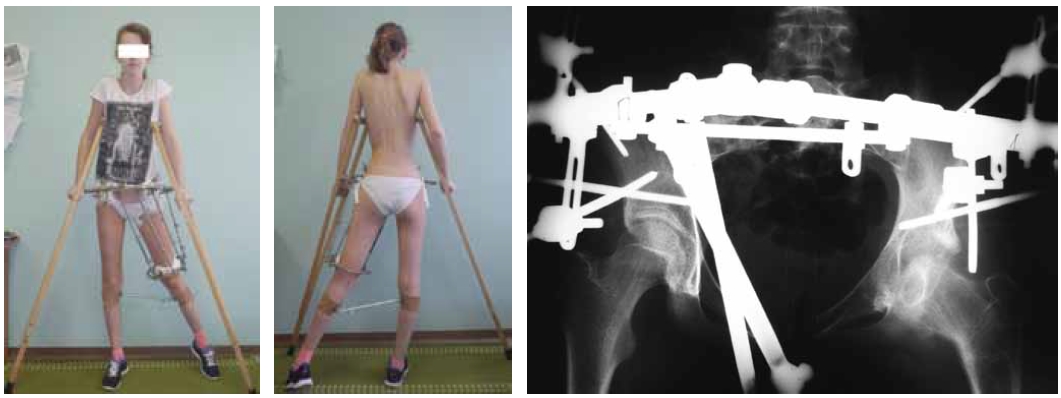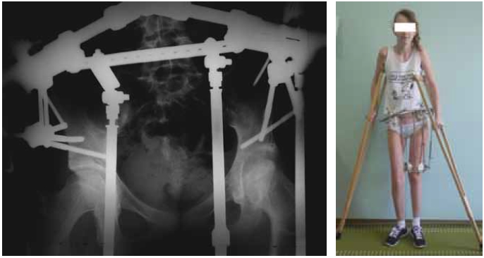 Fig. 3. Radiography image and patient appearance after the first stage of treatment. The distraction wire and rod apparatus is placed on the pelvis and the left hip; due to the distraction, the joint space of the left hip joint is stretched to 1.5 cm. The patient is activated in the apparatus