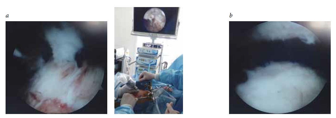 Fig. 4. Treatment and diagnostic arthroscopy of the hip joint: a — the joint cavity is absent, filled with scar tissues; b — after excision of scars, a joint cavity is formed