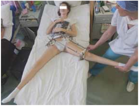 The distraction apparatus was reassembled. The left lower limb was removed from the vicious position and fixed in the apparatus in a functionally advantageous position of the limb with abduction of up to 15° (Fig. 6).