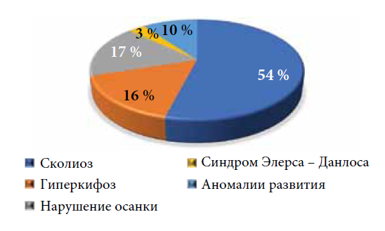 According to the literature, most commonly, pain in the back is local nociceptive in nature, that is, associated with a lesion of the musculoskeletal system with direct activation of pain receptors. Much less often, back pain occurs as a result of damage to the spinal root or ganglia and is neuropathic in nature, that is, associated with the involvement of the central or peripheral nervous system [22, 23, 52]. The leading causes of vertebral dorsalgia in pediatric patients are Perthes disease and hereditary syndromic pathology of the connective tissue, manifested by functional segmental instability of the spine. According to the literature, congenital anomalies of the spine account for 15%, scoliosis (idiopathic, secondary) is registered in 9%, Scheuermann’s disease occurs in 6%, tumors are noted in 2%, and sacroiliitis is revealed in 1%. In the adult population, in the study of the structure of vertebragenous pain syndromes, degenerative and dystrophic changes in the spine are also revealed most often [53–55].