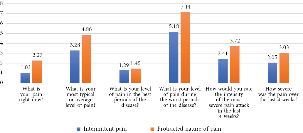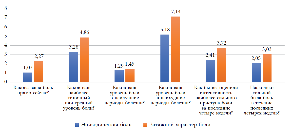 - In a qualitative assessment of pain intensity using VAS and the four-component pain scale, the threshold values of pain at the time of the survey, as well as the average level of pain over the last 4 weeks in patients with prolonged pain, exceeded twice the average values compared with children experiencing short-term episodes of pain (Figure 2), which indicates a direct correlation of the pain intensity and its frequency.