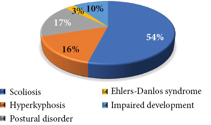 Idiopathic scoliosis was most common in pediatric patients (n = 122, 53%), 78% of the patients had deformity graded as degrees I–II, 15% had degree III deformity, and 7% had degree IV deformity. Kyphotic deformity of the thoracic spine was noted in 37 (16%) pediatric patients with osteochondropathy; various posture disorders were diagnosed in 43 (19%) patients; Ehlers–Danlos syndrome was noted in 7 (3%) patients; and congenital deformities with spinal anomalies were registered in 21 (9%) patients.