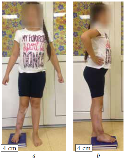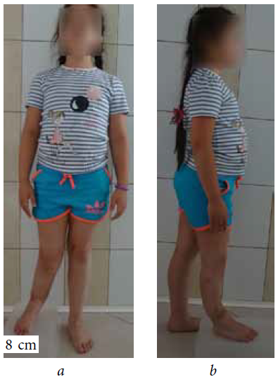 Fig. 5. Photographs of the patient after the disassembly of the external fixation device and the application of hemiepiphysiodesis to correct the recurrence of deformities: а — frontal view; b — lateral view