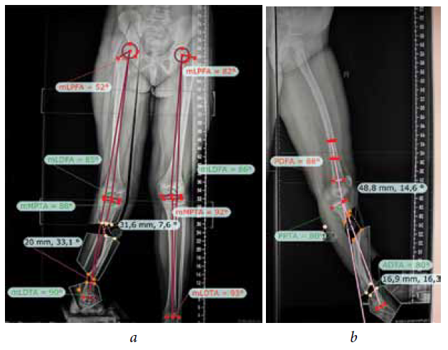 Following lengthening and deformity correction with transosseous apparatus and hemiepiphysiodesis, the accuracy achieved in eliminating the recurrence of deformities in the frontal plane was 100%. The period of deformity correction was 12–14 months.