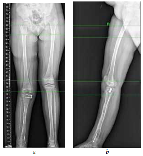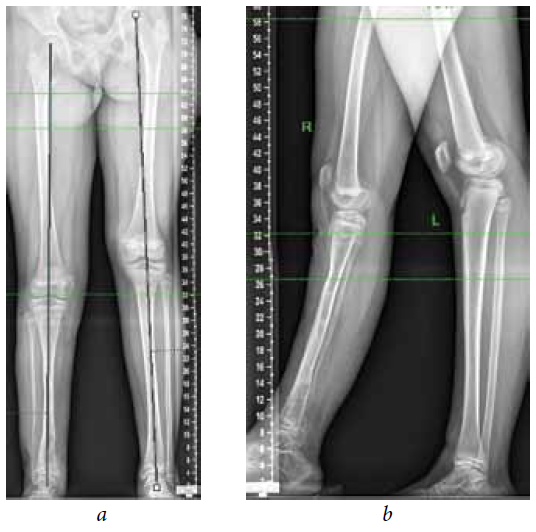 Fig. 7. Radiographs of the patient after removing the plate and screws according to hemiepiphysiodesis: а — anterior-posterior view; b — lateral view