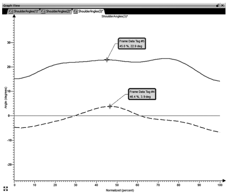 Fig. 1. Illustration of the shoulder joint rotation (screenshot of the Vicon Polygon program). The dashed line represents patients with joint hypermobility syndrome, and the solid one represents healthy subjects