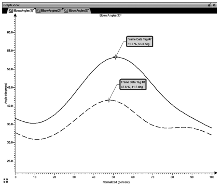 Fig. 2. Illustration of elbow joint flexion (screenshot of ViconPolygon program). The dashed line represents patients with joint hypermobility syndrome, and the solid one represents healthy subjects
