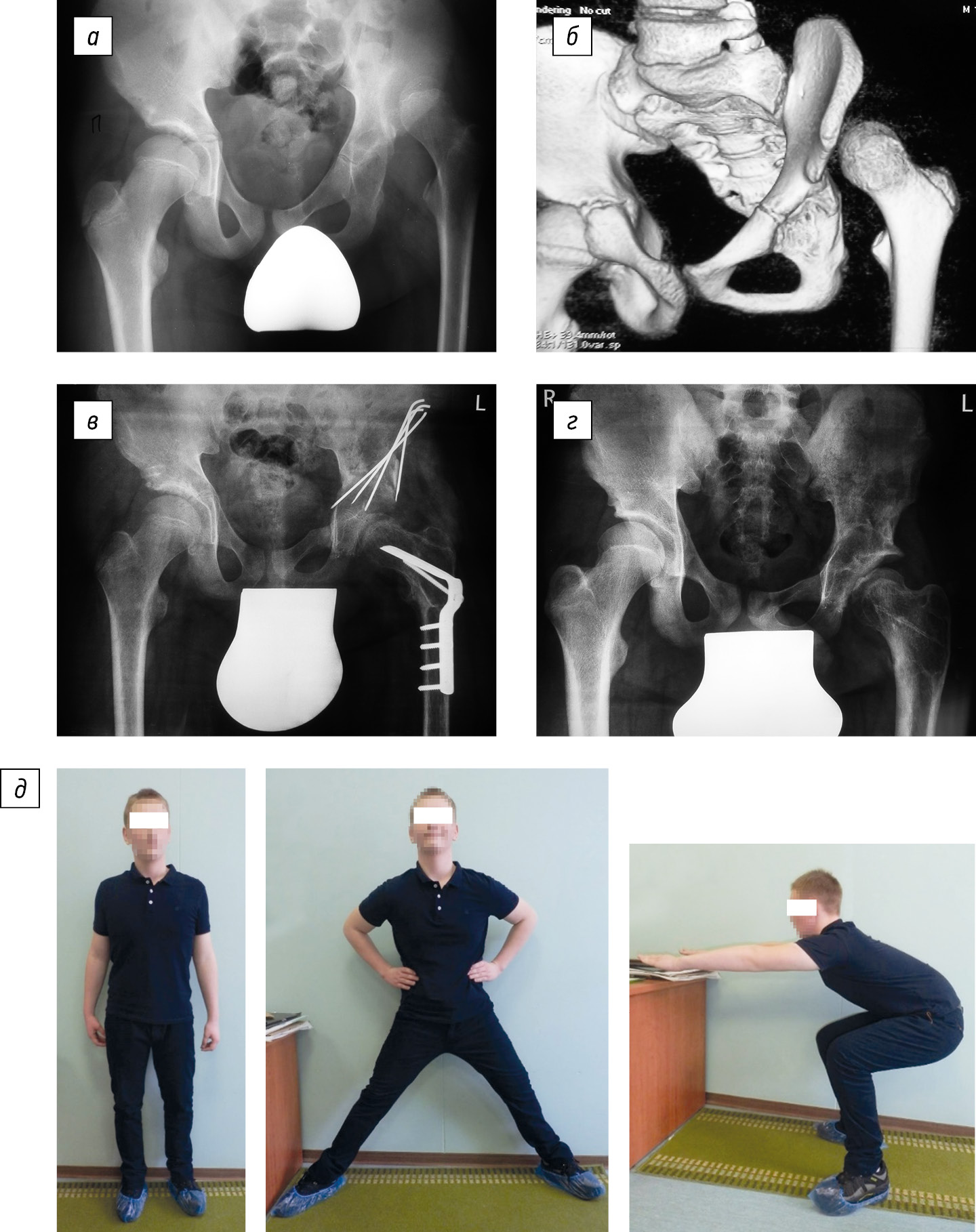 Fig. 3. Patient S. with high congenital dislocation of the left femur at the stages of treatment: a, radiograph at the age of 7 years before treatment revealed iliac dislocation of the left femur, the femoral head is located at the level of the iliac wing, and the discontinuity of the Shenton line is 5 cm; b, radiograph immediately after the staged treatment with the restoration of ratios in the left hip joint; c, X-ray result of treatment at the age of 15 years: grade IA according to the Severin classification; d, functional result of treatment (age 15 years): group “excellent” according to McKay’s criteria