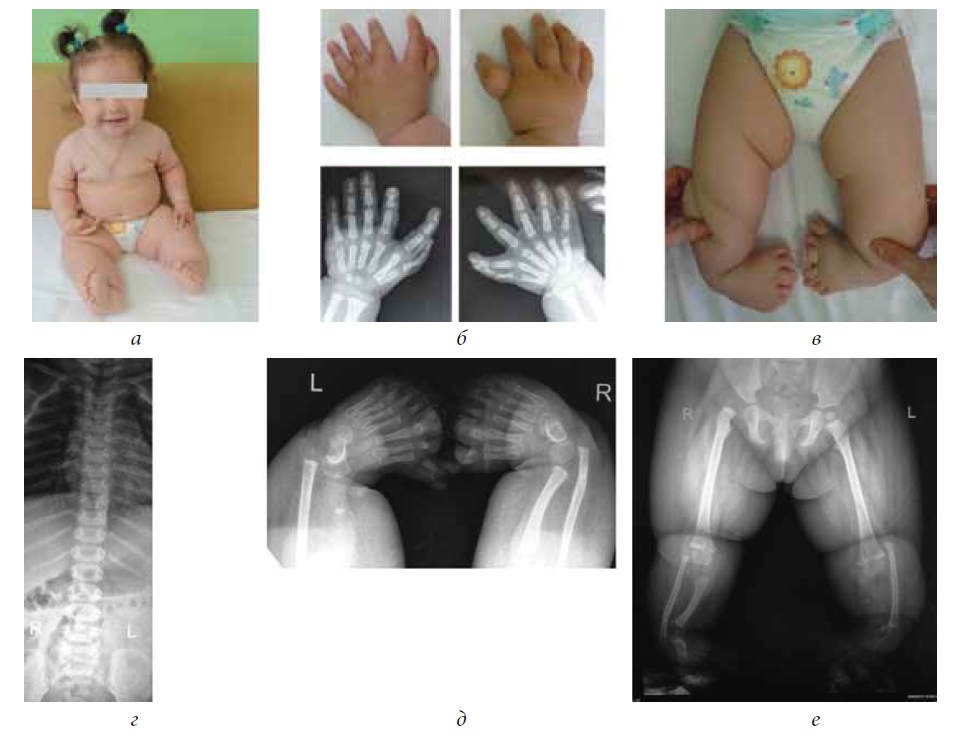 При рентгенологическом обследовании кистей наблюдается трехфалангизм с полидактилией (долихофалангеальная форма трехфалангизма). На рентгенограмме позвоночника патологии отмечено не было. Также у ребенка выявлены вывих правого бедра, гипоплазия большеберцовых костей с двух сторон, вывих малоберцовых костей, преаксиальная полидактилия и полифалангия на стопах (рис. 1, б, г–е). C учетом клинико-рентгенологической картины поставлен диагноз: «Мезомелическая дисплазия Вернера».
