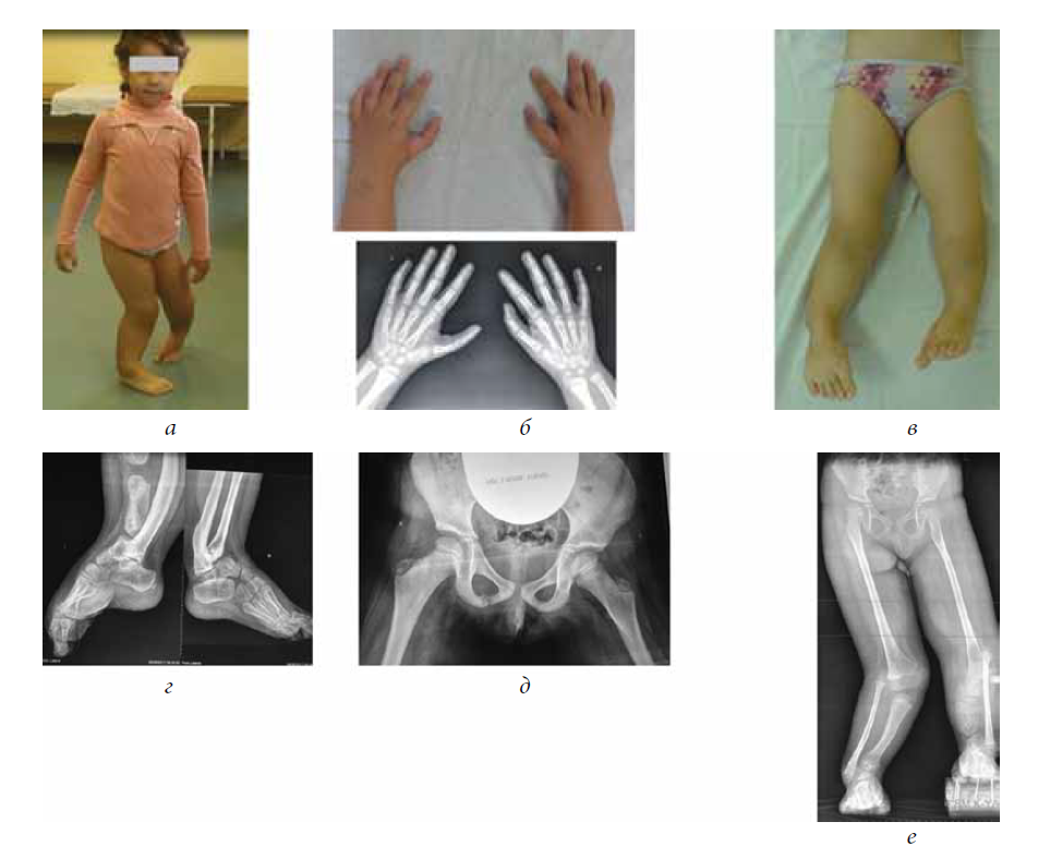 Рис. 2. Пациентка Ж., 5,5 года (через 3 года после операции): а — внешний вид пациентки; б — внешний вид и рентгенограммы кистей; в — внешний вид нижних конечностей; г — рентгенограммы стоп в боковой проекции; д — рентгенограммы тазобедренных суставов; е— панорамная рентгенограмма нижних конечностей стоя с компенсацией укорочения
