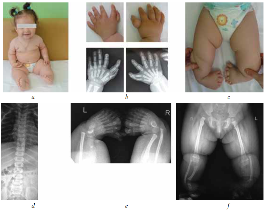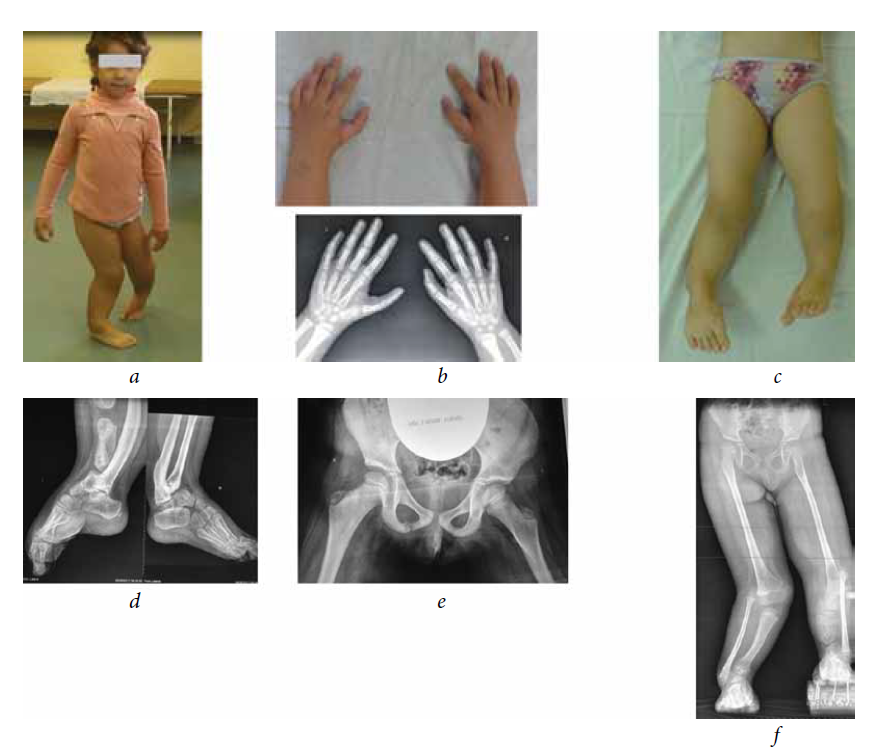 Fig. 1. Patient J., before surgery: а — patient’s appearance; b — the appearance and radiographs of the hands; c — the appearance of the lower extremities; d — radiographs of the spine; e — radiographs of the feet; f — radiographs of the lower extremities