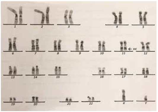 Fig. 2. Male karyotype, deletion of the long arm of chromosome 11 (locus 11q23)