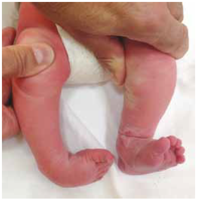 In everyday practice, cases of congenital idiopathic clubfoot are common; but there are very rare cases associated with connective tissue pathologies, neurological conditions, and chromosomal abnormalities [5, 9, 10]. The available literature provides only single references to this pathology, and there are also no data on its severity, methods, or results of treatment [1]. A small number of reports on the use of the Ponseti method for treating congenital syndromic clubfoot have been published [9, 11–13]. Janicki et al. [11] reported that patients with syndromic clubfoot needed more plaster casts, and often had relapses of the deformities, compared with idiopathic clubfoot. Moroney et al. [13], described the treatment of 29 patients with non-idiopathic clubfoot, and indicated primary correction success in 91% of cases; however, deformity relapse occurred in 44 and 37% cases, which required extensive surgical treatments. Gurnett et al. [10] also believe that more plaster casts were required to treat non-idiopathic clubfoot using the Ponseti method. All authors noted the efficacy of the Ponseti method and recommended it as a first-line treatment for syndromic or non-idiopathic congenital clubfoot.