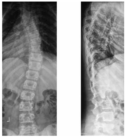 Рис. 1. Рентгенограммы позвоночника пациентки Ф., 11 лет, в двух проекциях до оперативного лечения